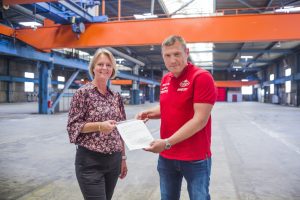 Lokalbanksjef Annette Vanem Jønsson i SpareBank1 overrekker 150.000 kroner til styreleder i StjernenUng, Roy Freddy Andersen