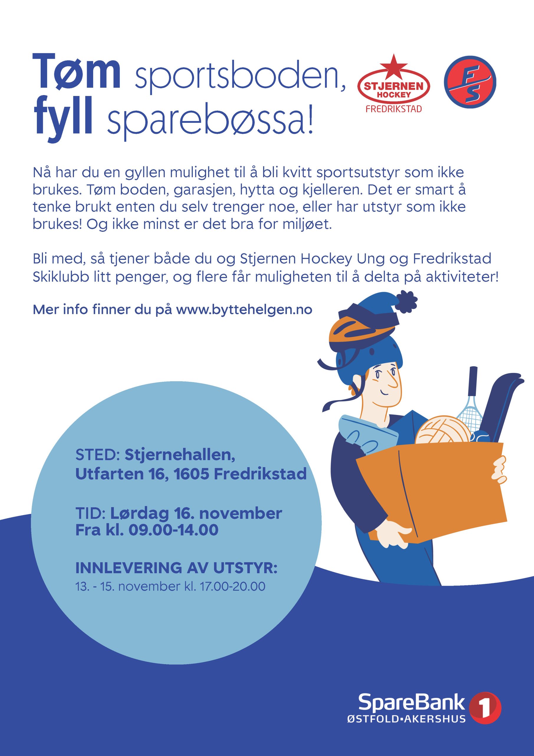 Har du sportsutstyr du ikke bruker lenger? Da har du en gyllen mulighet til å bli kvitt det og samtidig tjene penger til Stjernen Hockey Ung og Fredrikstad Skiklubb!