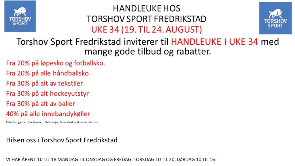 I UKE 34 (19. TIL 24. AUGUST) inviterer Torshov Sport Fredrikstad til HANDLEUKE I UKE 34 med mange gode tilbud og rabatter.