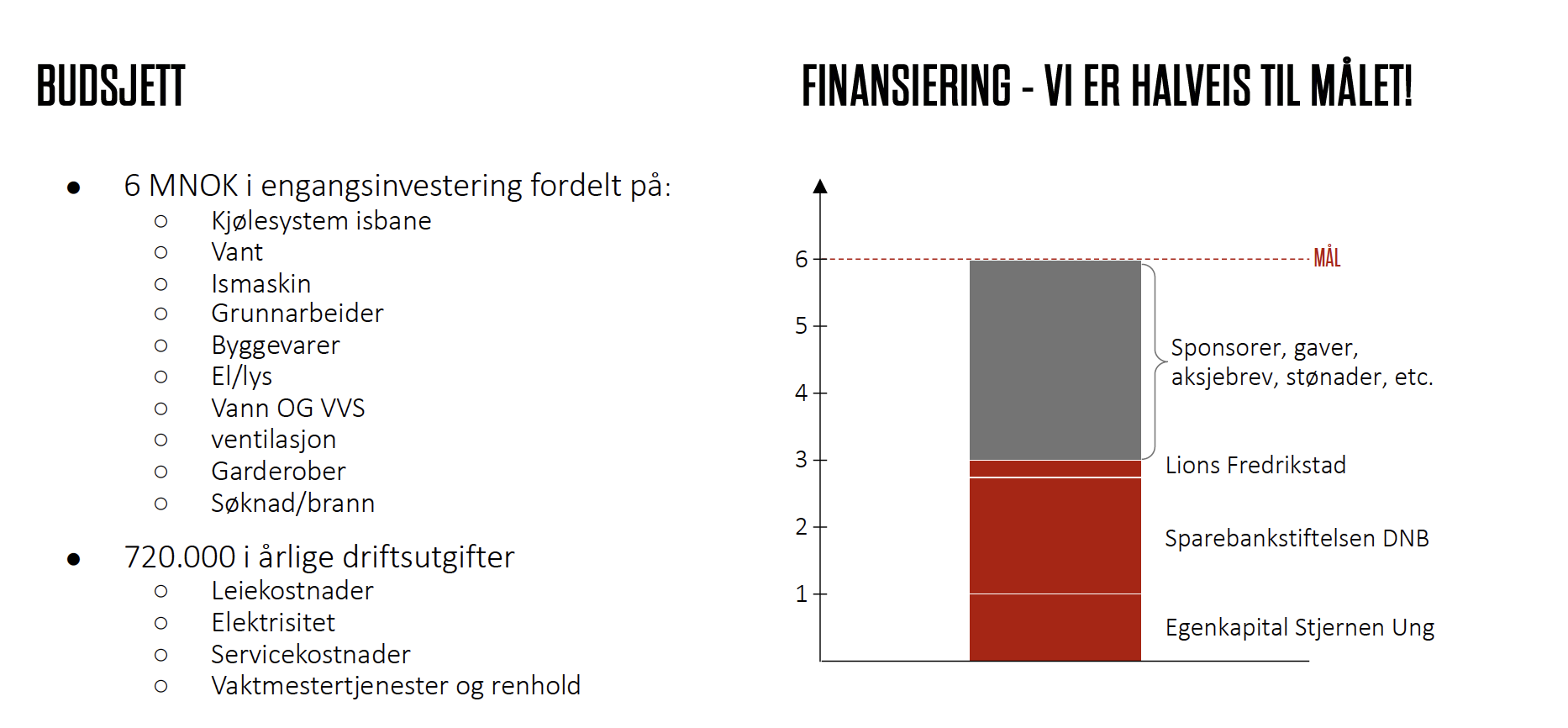 Stjernen Ung håper hele Fredrikstad stiller opp for å få til dette prosjektet. Enten du er firma eller privatperson, om du kan bidra med mye eller lite: Enhver støtte gjør at isbanen rykker nærmere virkeligheten.