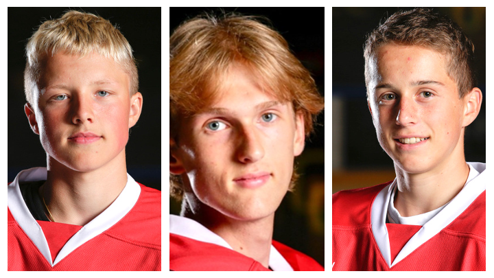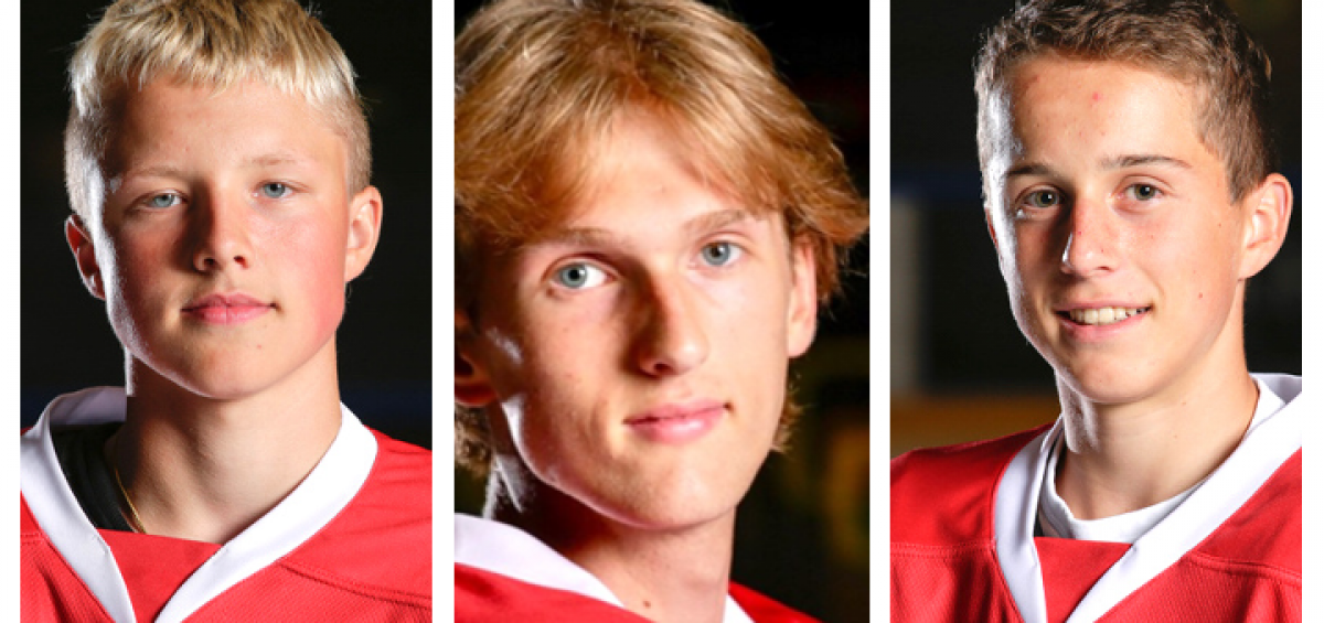 Fra venstre: Eskil Stene, Theodor Jakobsen og Sondre Grønli er tatt ut til firedagers landslagssamling for U16 i Skien Ishall, 17.-20. september 2020.
