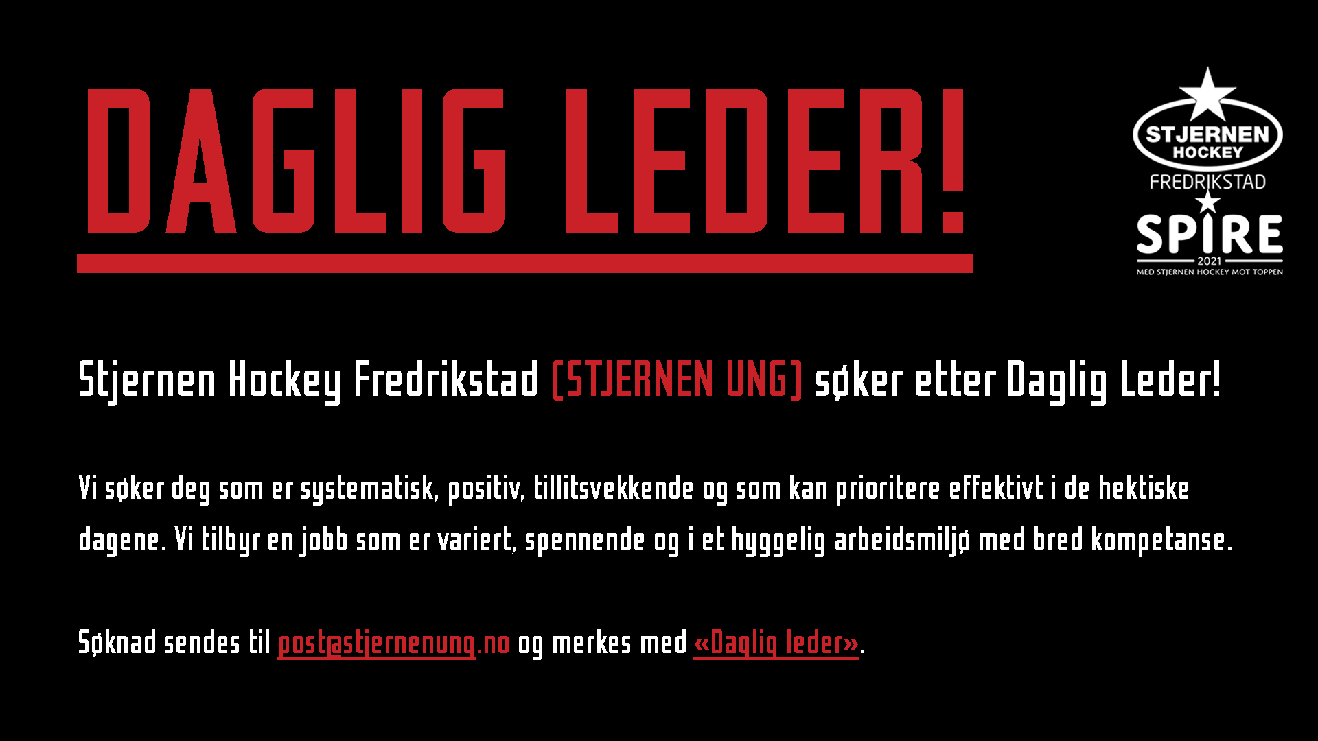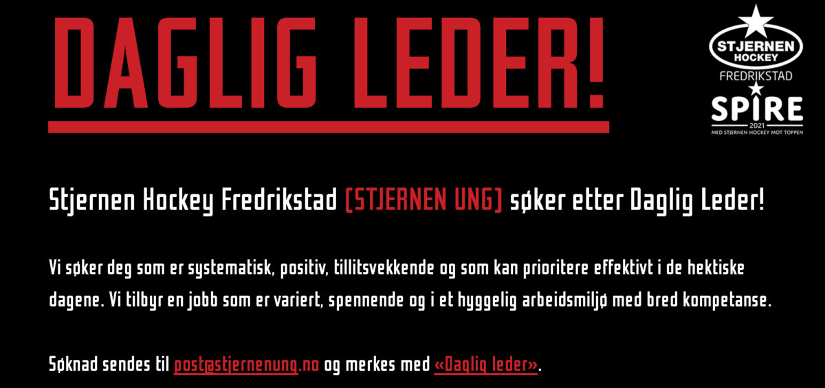 Med bakgrunn i endringer i organisasjonen og med nye Fredrikstad Arena i sikte, søker Stjernen UNG etter daglig leder. Stjernen UNG drives med eget organisasjonsnummer og er ansvarlige for all aktivitet fra klubbens hockeyskole for de yngste til klubbens alle ungdomslag fordelt i årsklasser fra U8 til U21.