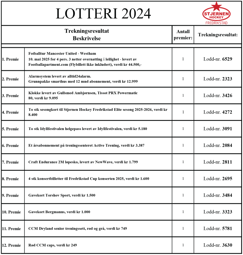 Stjernen Ung takker alle som har bidratt og støttet vårt lotteri i 2024! Vi er utrolig takknemlige for støtten fra våre medlemmer, sponsorer og lokalsamfunn som gjør det mulig for oss å satse videre på ishockey for barn og unge i Fredrikstad.
